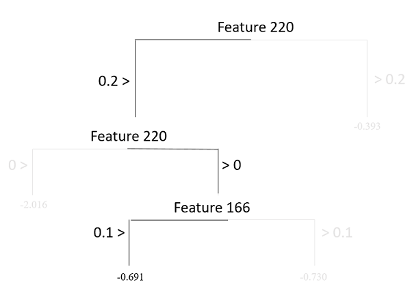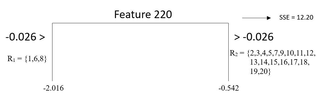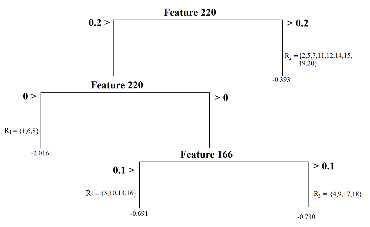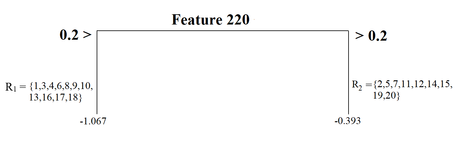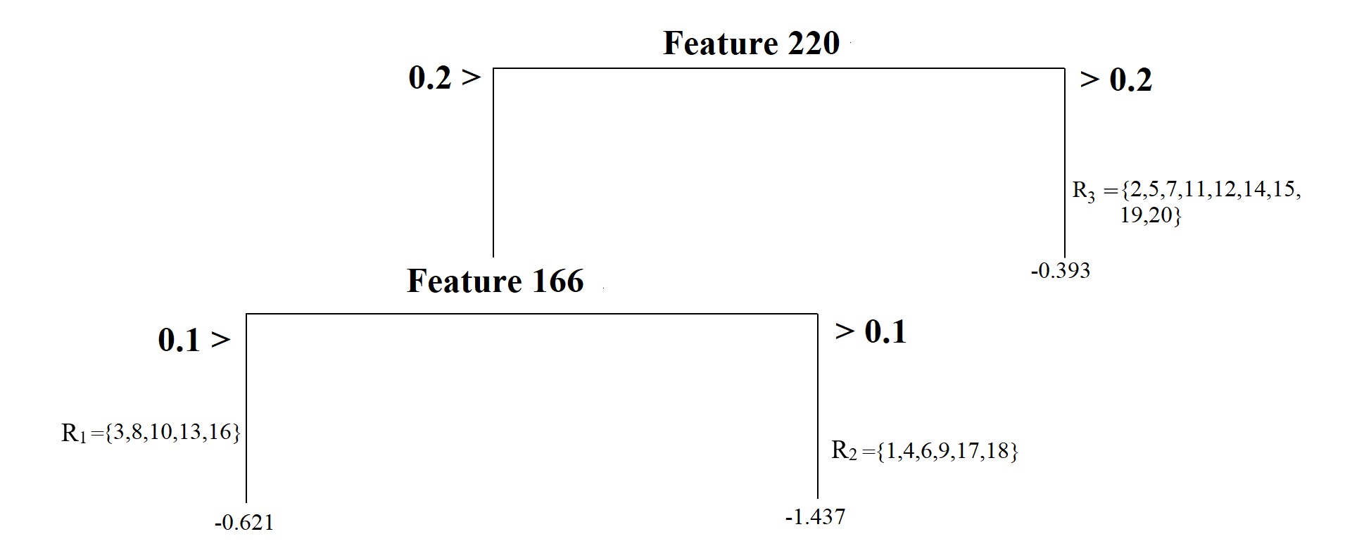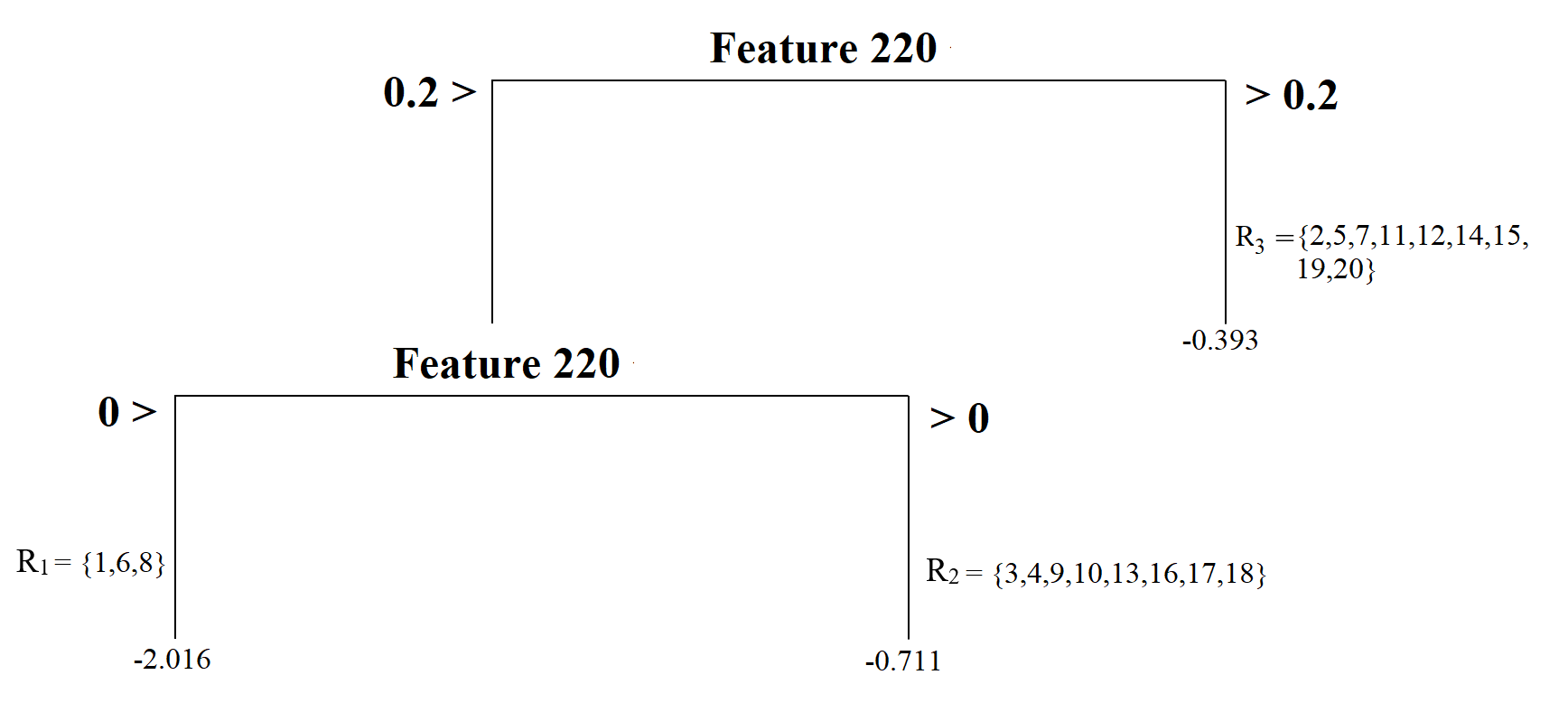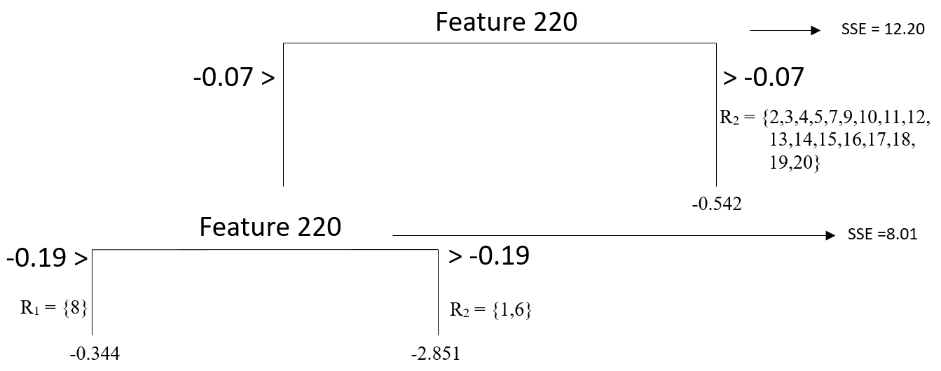 class: center, middle, inverse, title-slide .title[ # Introduction to Decision Tree Algorithm ] .author[ ### Cengiz Zopluoglu ] .institute[ ### College of Education, University of Oregon ] --- <style> .blockquote { border-left: 5px solid #007935; background: #f9f9f9; padding: 10px; padding-left: 30px; margin-left: 16px; margin-right: 0; border-radius: 0px 4px 4px 0px; } #infobox { padding: 1em 1em 1em 4em; margin-bottom: 10px; border: 2px solid black; border-radius: 10px; background: #E6F6DC 5px center/3em no-repeat; } .centering[ float: center; ] .left-column2 { width: 50%; height: 92%; float: left; padding-top: 1em; } .right-column2 { width: 50%; float: right; padding-top: 1em; } .remark-code { font-size: 18px; } .tiny .remark-code { /*Change made here*/ font-size: 75% !important; } .tiny2 .remark-code { /*Change made here*/ font-size: 60% !important; } .indent { margin-left: 3em; } .single { line-height: 1 ; } .double { line-height: 2 ; } .title-slide h1 { padding-top: 0px; font-size: 40px; text-align: center; padding-bottom: 18px; margin-bottom: 18px; } .title-slide h2 { font-size: 30px; text-align: center; padding-top: 0px; margin-top: 0px; } .title-slide h3 { font-size: 30px; color: #26272A; text-align: center; text-shadow: none; padding: 10px; margin: 10px; line-height: 1.2; } </style> ### The goals: Decision Trees - The basics of a decision tree - Tree structure - Predictions from a decision tree - Loss function - Growing a decision tree model - Pruning a decision tree model - The `rpart()` function - Review of Kaggle notebooks for building Decision Tree models --- # Decision Trees - In this lecture, we will again consider the toy readability dataset (N=20) - We used to predict a readability score from two predictors: Feature 220 and Feature 166 .indent[ .single[ .tiny2[ ```r readability_sub <- read.csv(here('data/readability_sub.csv'), header=TRUE) readability_sub[,c('V220','V166','target')] ``` ``` V220 V166 target 1 -0.13908 0.19028 -2.06282 2 0.21764 0.07101 0.58259 3 0.05812 0.03993 -1.65313 4 0.02526 0.18846 -0.87391 5 0.22431 0.06201 -1.74049 6 -0.07795 0.10754 -3.63994 7 0.43401 0.12202 -0.62284 8 -0.24365 0.02455 -0.34427 9 0.15894 0.10422 -1.12299 10 0.14496 0.02340 -0.99857 11 0.34223 0.22065 -0.87657 12 0.25219 0.10865 -0.03305 13 0.03533 0.07549 -0.49530 14 0.36411 0.18676 0.12454 15 0.29989 0.11618 0.09678 16 0.19837 0.08273 0.38422 17 0.07807 0.10235 -0.58143 18 0.07936 0.11619 -0.34325 19 0.57001 -0.02385 -0.39054 20 0.34523 0.09300 -0.67548 ``` ]]] --- # Basics of a decision tree ### Tree Structure Let's imagine a simple tree model to predict readability scores from Feature 220.  This model splits the sample into two pieces using a **split point** of 0.2 for the predictor variable (Feature 220). There are 11 observations with Feature 220 less than 0.2 and nine with Feature 220 larger than 0.2. The top of the tree model is called **root node**, and the `\(R_1\)` and `\(R_2\)` in this model are called **terminal nodes**. ---  - This model has two terminal nodes. - There is a number assigned to each terminal node. These numbers are the average values for the target outcome (readability score) for those observations in that specific node. It can be symbolically shown as `$$\bar{Y_t} = \frac{1}{n_t}\sum_{i\epsilon R_t} Y_i,$$` .indent[ where `\(n_t\)` is the number of observations in a terminal node, and `\(R_t\)` represents the set of observations in the `\(t_{th}\)` node. ] ---  - There is also a concept of **depth** of a tree. - The root node is counted as depth 0, and each split increases the depth of the tree by one. In this case, we can say that this tree model has a depth of one. --- We can increase the complexity of our tree model by splitting the first node into two more nodes using a split point of 0.  Now, our model has a **depth of two** and a total of **three terminal nodes**. Each terminal node is assigned a score by computing the average outcome for those observations in that node. --- The tree model can have nodes from splitting another variable. For instance, the model below first splits the observations based on Feature 220, then based on Feature 166, yielding a tree model again with **three nodes** with a **depth of two**. This tree model's complexity is the same as the previous one's; the only difference is that we have nodes from two predictors instead of one. <br>  --- A final example is another tree model with increasing complexity and having a depth of three and four nodes. It first splits observations based on whether or not Feature 220 is less than 0.2, then splits observations based on whether or not Feature 220 is less than 0, and finally splits observations based on whether or not Feature 166 is less than 0.1.  --- ### Predictions Suppose you developed a tree model and decided to use this model to make predictions for new observations. Let's assume our model is the below.  --- How do we use this model to make predictions for new observations? Suppose that there is a new reading passage: - The value for Feature 220 is - 0.5 - The value for Feature 166 is 0. What is the predicted readability score for this passage based on this tree model? You can trace a path starting from the **root node** (top of the tree) and see where this reading passage will end. <center>  --- Suppose you have another new reading passage: - The value for Feature 220 is 0.1 - The value for Feature 166 is 0. What is the predicted readability score for this passage based on this tree model? <center>  --- ### Loss function When we fit a tree model, the algorithm decides the best split that minimizes the sum of squared errors. The sum of squared error from a tree model can be shown as `$$SSE = \sum_{t=1}^{T} \sum_{i \epsilon R_t} (Y_i - \hat{Y}_{R_{t}})^2$$` where `\(T\)` is the total number of terminal nodes in the tree model, and `\(\hat{Y}_{R_{t}}\)` is the prediction for the observations in the `\(t^{th}\)` node (average target outcome for those observations in the `\(